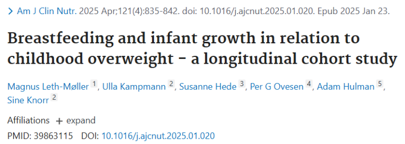 Leth-Møller M, Kampmann U, Hede S, Ovesen PG, Hulman A, Knorr S. Breastfeeding and infant growth in relation to childhood overweight - a longitudinal cohort study. Am J Clin Nutr. 2025 Apr;121(4):835-842. doi: 10.1016/j.ajcnut.2025.01.020. Epub 2025 Jan 23. PMID: 39863115.