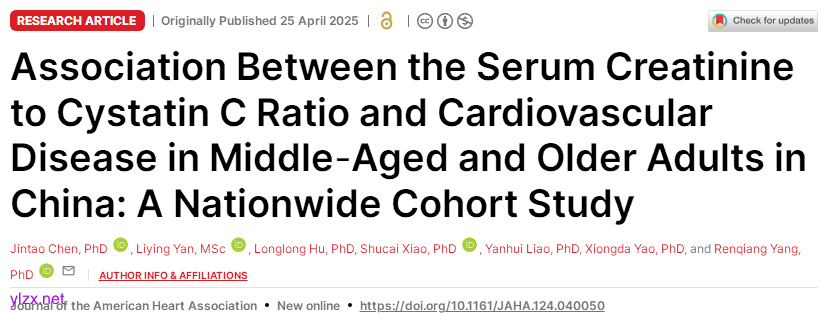 Jintao Chen,et al.Association Between the Serum Creatinine to Cystatin C Ratio and Cardiovascular Disease in Middle‐Aged and Older Adults in China: A Nationwide Cohort Study.JAHA.2025.https://www.ahajournals.org/doi/full/10.1161/JAHA.124.040050