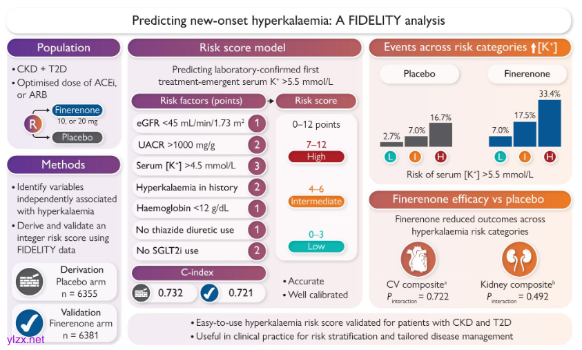 该研究的主要结局为新发高钾血症(血清钾>5.5 mmol/L)。来自安慰剂组的数据用于推导,来自非奈利酮组的数据用于验证。研究人员建立了一个整数风险评分,并将其分为低、中、高风险高钾血症三类。该研究评估的疗效结局包括心血管和肾脏组合。