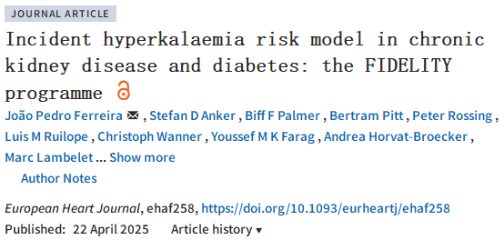 João Pedro Ferreira,et al.Incident hyperkalaemia risk model in chronic kidney disease and diabetes: the FIDELITY programme.European Heart Journal.2025.https://academic.oup.com/eurheartj/advance-article/doi/10.1093/eurheartj/ehaf258/8117245