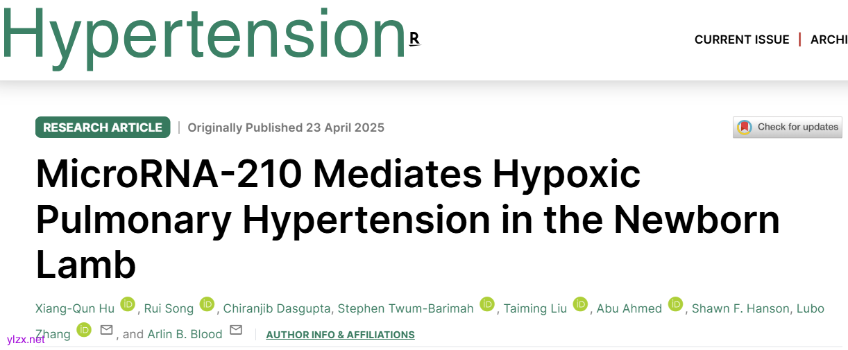 HYPERTENSION:重大突破 | microRNA-210介导机制揭示新生儿缺氧性肺动脉高压关键病因