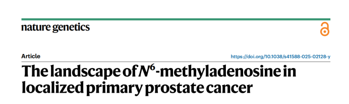 近日,国际权威期刊Nature Genetics上在线发表了题为“The landscape of N6-methyladenosine in localized primary prostate cancer”的最新研究成果,该研究揭示了m⁶A修饰在前列腺癌中的分布特征及其与临床病理特征的关联,阐明了m⁶A修饰作为前列腺癌潜在生物标志物和治疗靶点的作用机制。