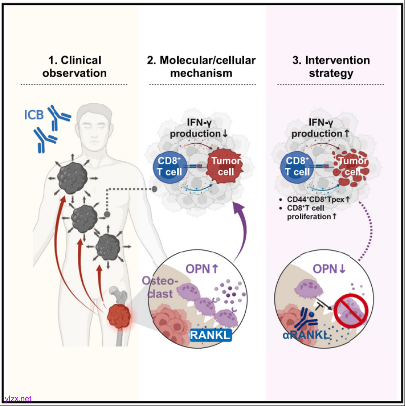 综上所述,该研究揭示了骨骼转移通过破骨细胞分泌的OPN远程抑制非骨骼肿瘤对ICB疗法的响应。这一发现不仅为理解骨骼转移对全身免疫反应的影响提供了新的视角,还为改善骨骼转移患者的ICB治疗效果提供了潜在的治疗策略。通过阻断RANKL信号通路或直接中和OPN,可以有效恢复非骨骼肿瘤对ICB疗法的敏感性,为临床治疗提供了新的方向。未来的研究可以进一步探索OPN在其他类型肿瘤转移中的作用,以及开发针对OPN的新型治疗药物。