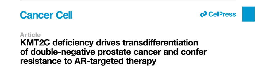 KMT2C deficiency drives transdifferentiation of double-negative prostate cancer and confer resistance to AR-targeted therapy. Cancer Cell. 2025 Apr 22:S1535-6108(25)00139-4. doi: 10.1016/j.ccell.2025.04.002. Epub ahead of print. PMID: 40280125.