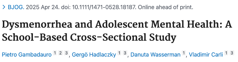Gambadauro P, Hadlaczky G, Wasserman D, Carli V. Dysmenorrhea and Adolescent Mental Health: A School-Based Cross-Sectional Study. BJOG. 2025 Apr 24. doi: 10.1111/1471-0528.18187. Epub ahead of print. PMID: 40270448.