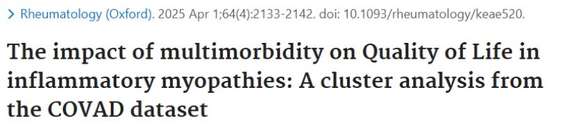 Fornaro M, Venerito V, Pellico MR, Iannone F, Joshi M, Chen YM, Tan AL, Saha S, Chatterjee T, Agarwal V, Shinjo SK, Hoff LS, Kadam E, Ziade N, Velikova T, Hasan ATMT, Shumnalieva R, Milchert M, Tan CL, Gracia-Ramos AE, Cavagna L, Vaidya B, Kuwana M, Shaharir SS, Knitza J, Makol A, Tehozol EAZ, Serrano JR, Halabi H, Dey D, Toro-Gutiérrez CE, Goo PA, Caballero-Uribe CV, Distler O, Katchamart W, Day J, Parodis I, Nikiphorou E, Chinoy H, Agarwal V, Gupta L; CoVAD Study Group. The impact of multimorbidity on Quality of Life in inflammatory myopathies: A cluster analysis from the COVAD dataset. Rheumatology (Oxford). 2025 Apr 1;64(4):2133-2142. doi: 10.1093/rheumatology/keae520. PMID: 39324556; PMCID: PMC11962953.