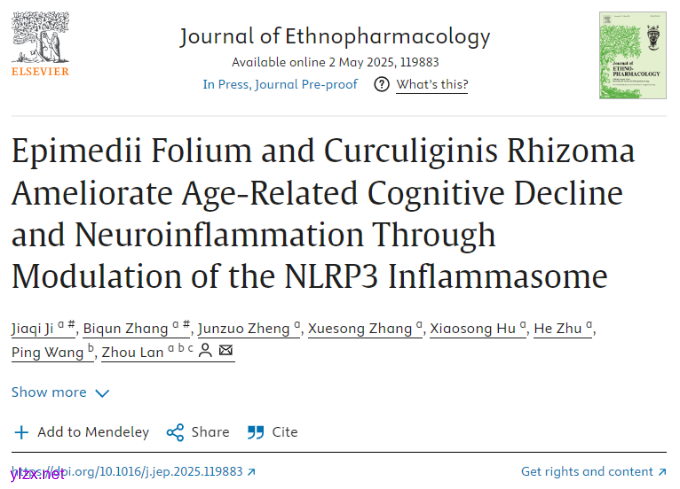 Ji J, Zhang B, Zheng J, et al. Epimedii Folium and Curculiginis Rhizoma Ameliorate Age-Related Cognitive Decline and Neuroinflammation Through Modulation of the NLRP3 Inflammasome. J Ethnopharmacol. Published online May 2, 2025. doi:10.1016/j.jep.2025.119883