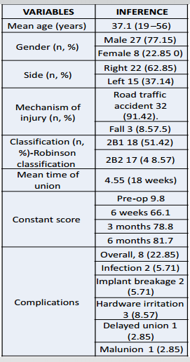 材料与方法:在2022年8月至2024年4月期间,对在切蒂纳德医院接受钛弹性髓内钉系统治疗的35例年龄在16至60岁之间的锁骨中段骨折患者进行了一项描述性横断面研究。使用Constant-Murley评分评估功能结局,并拍摄X光片以评估骨折愈合情况。