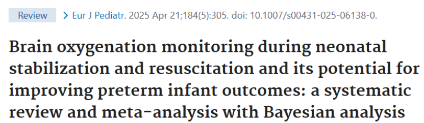 Bruckner M, Suppan T, Suppan E, Schwaberger B, Urlesberger B, Goeral K, Hammerl M, Perme T, Dempsey EM, Springer L, Lista G, Szczapa T, Fuchs H, Karpinski L, Bua J, Law B, Buchmayer J, Kiechl-Kohlendorfer U, Cerar LK, Schwarz CE, Gründler K, Stucchi I, Klebermass-Schrehof K, Schmölzer GM, Pichler G. Brain oxygenation monitoring during neonatal stabilization and resuscitation and its potential for improving preterm infant outcomes: a systematic review and meta-analysis with Bayesian analysis. Eur J Pediatr. 2025 Apr 21;184(5):305. doi: 10.1007/s00431-025-06138-0. PMID: 40259049; PMCID: PMC12011959.