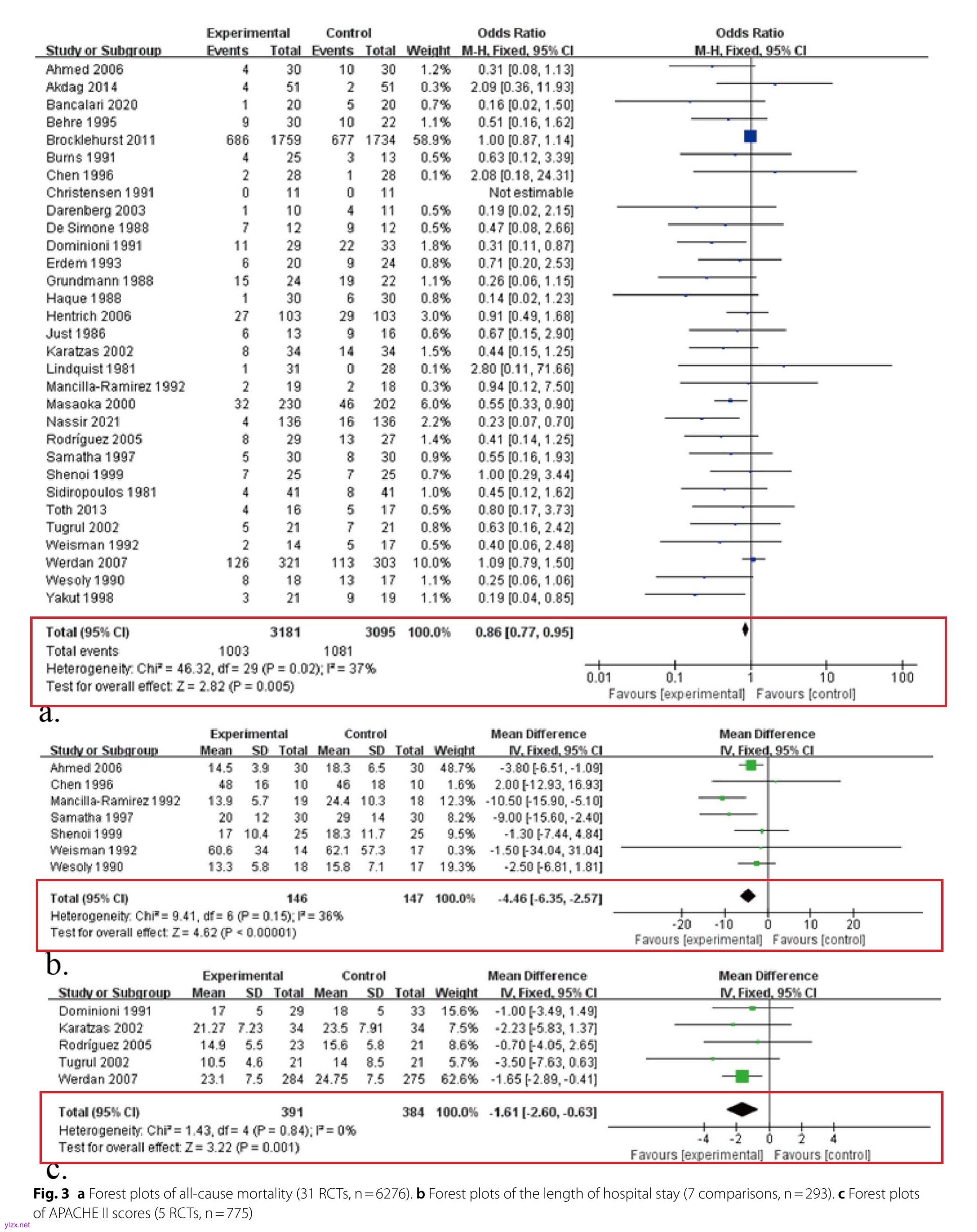 图1 a全因死亡率森林图(31项RCT,n=6276);b住院时间森林图(7项比较性研究,n=293)。c APACHE II评分森林图(5项RCT,n=775)