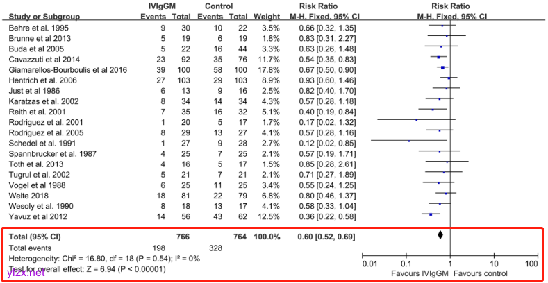 另一项Meta分析共纳入19项研究,涉及1530例脓毒症/脓毒性休克患者。结果显示:使用富含IgM的IVIG可降低脓毒症患者死亡风险(RR 0.60;95%CI 0.52-0.69,I²=0%,图5),表明,富含IgM的IVIG可使脓毒症/脓毒性休克患者死亡风险降低40%13。