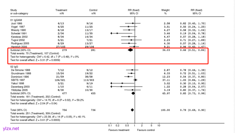 一项Meta分析共纳入27项RCT,共涉及2202例脓毒症/脓毒性休克患者。结果显示:富含IgM的IVIG可以显著降低全因死亡风险(RR = 0.66,95% CI为0.51–0.84,P≤0.0009,图4),且与仅含IgG的制剂相比趋势更加明显(RR = 0.85,95% CI为0.73–0.99,P≤0.04)。表明,富含IgM的IVIG可使得脓毒症和脓毒性休克患者死亡风险降低34%12。