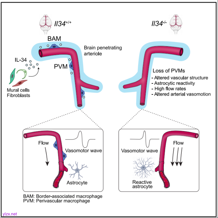 近年来,研究发现巨噬细胞的发育和功能依赖于集落刺激因子1(CSF-1)及其受体(CSF-1R),而白细胞介素-34(IL-34)作为CSF-1R的另一个配体,对小胶质细胞的稳态维持至关重要。然而,IL-34是否也对BAMs的稳态维持起作用,以及BAMs如何影响脑血管功能,这些问题尚未得到充分解答。