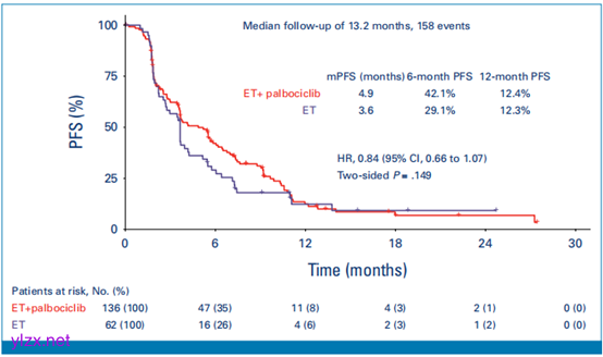 截至主要疗效分析的数据截止日期(2023年2月2日),帕博西尼联合内分泌治疗组的中位研究者评估PFS为4.9个月(95% CI, 3.6 - 6.1),单纯内分泌治疗组为3.6个月(95% CI, 2.5 - 4.2),风险比(HR)为0.84(95% CI, 0.66 - 1.07;P = 0.149)。在6个月和12个月的里程碑分析中,帕博西尼联合内分泌治疗组的PFS率分别为42.1%(95% CI, 33.3 - 50.7)和12.4%(95% CI, 6.8 - 19.8),单纯内分泌治疗组分别为29.1%(95% CI, 18.1 - 40.9)和12.3%(95% CI, 4.9 - 23.5)。总生存期数据在数据截止时尚不成熟,帕博西尼联合内分泌治疗组的中位OS为28.3个月(95% CI, 20.9 - 36.2),单纯内分泌治疗组为27.7个月(95% CI, 19.5 - 35.4),HR为1.06(95% CI, 0.75 - 1.51)。局部确定的ORR在帕博西尼联合内分泌治疗组和单纯内分泌治疗组分别为4.4%和1.6%,在有可测量疾病的患者中分别为6.4%和2.3%。临床获益率在帕博西尼联合内分泌治疗组为41.9%,单纯内分泌治疗组为27.4%,两组间差异的比值比为0.62(95% CI, 0.38 - 0.98,P = 0.044)。