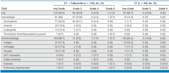 帕博西尼联合内分泌治疗组和单纯内分泌治疗组中,任何级别的治疗相关不良事件(TEAEs)发生率分别为92.6%和86.7%,≥3级的TEAEs发生率分别为47.4%和10.0%。帕博西尼联合内分泌治疗组中,除中性粒细胞减少外,大多数TEAEs为1级或2级,而该组出现了3级或4级血液学TEAEs,包括中性粒细胞减少(38.5%)、白细胞减少(3.7%)、贫血(3.0%)和血小板减少(0.7%)。严重TEAEs在帕博西尼联合内分泌治疗组和单纯内分泌治疗组的发生率分别为7.4%和3.3%,其中有两例严重TEAEs与帕博西尼相关(肺炎和转氨酶升高),帕博西尼联合内分泌治疗组有两名患者因无关毒性死亡(肺动脉高压和血栓性血小板减少性紫癜),无治疗相关死亡报告。