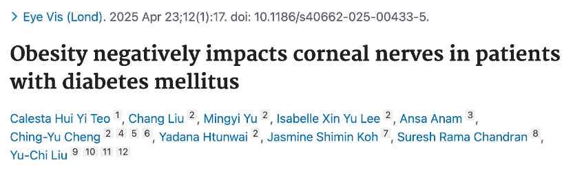 Teo CHY, Liu C, Yu M, Lee IXY, Anam A, Cheng CY, Htunwai Y, Koh JS, Chandran SR, Liu YC. Obesity negatively impacts corneal nerves in patients with diabetes mellitus. Eye Vis (Lond). 2025 Apr 23;12(1):17. doi: 10.1186/s40662-025-00433-5. PMID: 40270066; PMCID: PMC12016176.