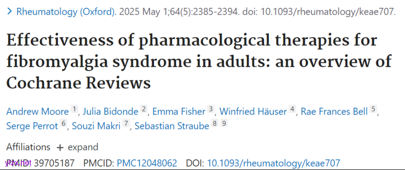 Moore A, Bidonde J, Fisher E, Häuser W, Bell RF, Perrot S, Makri S, Straube S. Effectiveness of pharmacological therapies for fibromyalgia syndrome in adults: an overview of Cochrane Reviews. Rheumatology (Oxford). 2025 May 1;64(5):2385-2394. doi: 10.1093/rheumatology/keae707. PMID: 39705187; PMCID: PMC12048062.