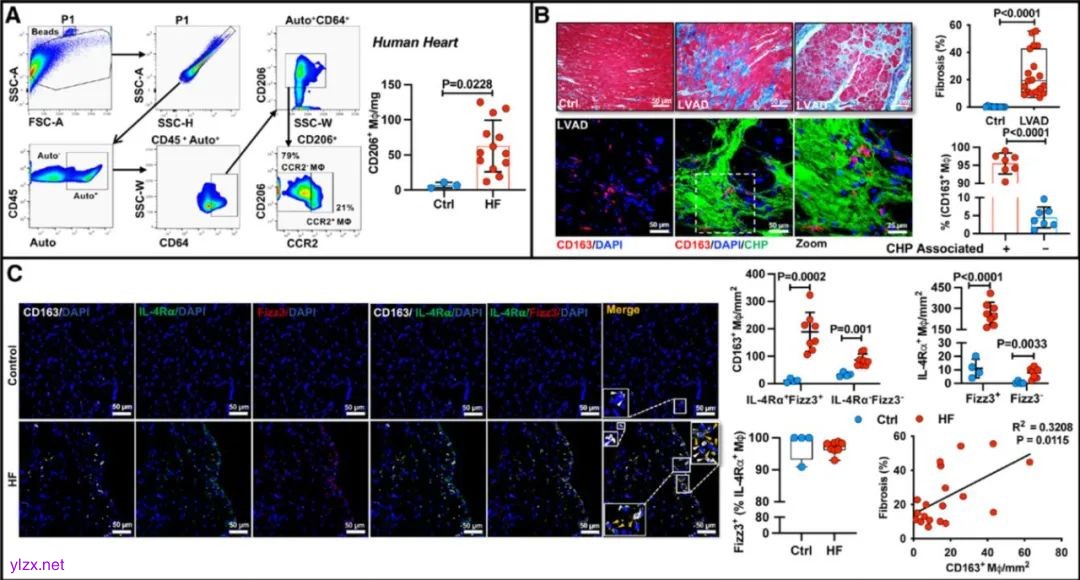 图4. CD206+/CD163+巨噬细胞在心衰患者心脏显著扩增,并高表达IL-4Rα和FIZZ3,且与心机纤维化正相关