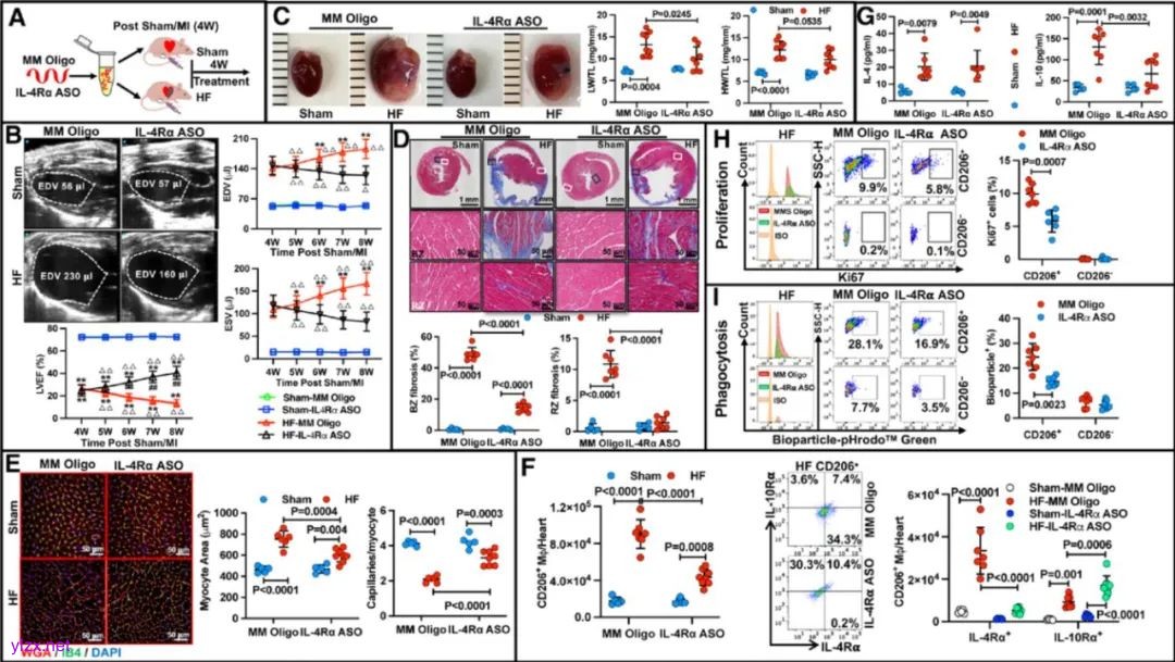 图3. 在体IL-4Rα表达抑制可清除心衰心脏CD206+巨噬细胞亚群及逆转左室重构