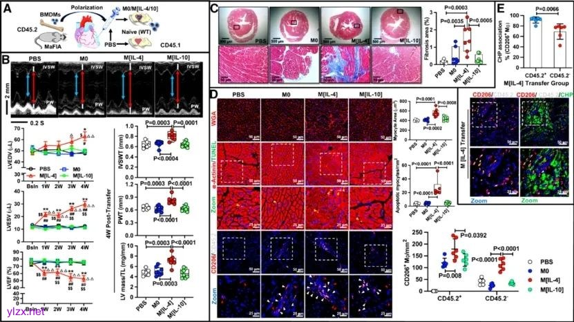 图1. 心肌原位移植IL-4诱导型巨噬细胞(CD206+IL-4Rα+)诱发心功能减退及心肌纤维化