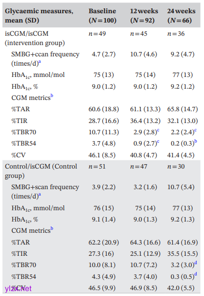 · 血糖检测频率:isCGM/isCGM组从基线4.7±2.7次/日增至12周10.7±4.6次/日(p<0.01),24周维持9.2±4.7次/日(p<0.01);Control/isCGM组在扩展阶段从3.2±1.6次/日升至10.7±5.4次/日(p<0.01)。