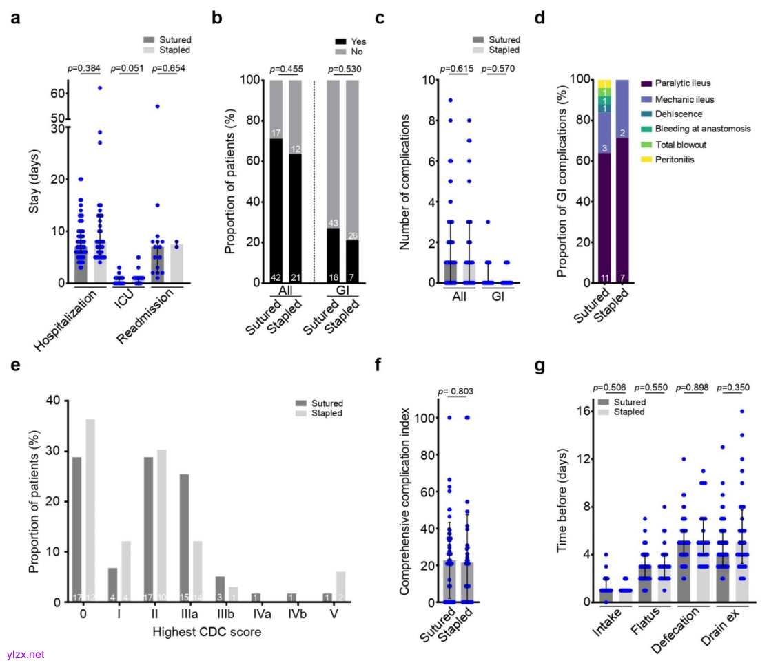 结果显示,共有23例患者(25%)出现胃肠道并发症,其中麻痹性肠梗阻最为常见(17%)。手工缝合组(27%)和吻合器组(21%)的胃肠道并发症发生率相当(p=0.530,优势比1.38)。手工缝合组的平均手术时长为300分钟,吻合器组为313分钟(p=0.124)。两组的中位住院时长均为8天(p=0.384)。手工缝合组的再入院率较高(25% vs. 6%,p=0.022,优势比5.28),但这主要是由于非胃肠道并发症所致。